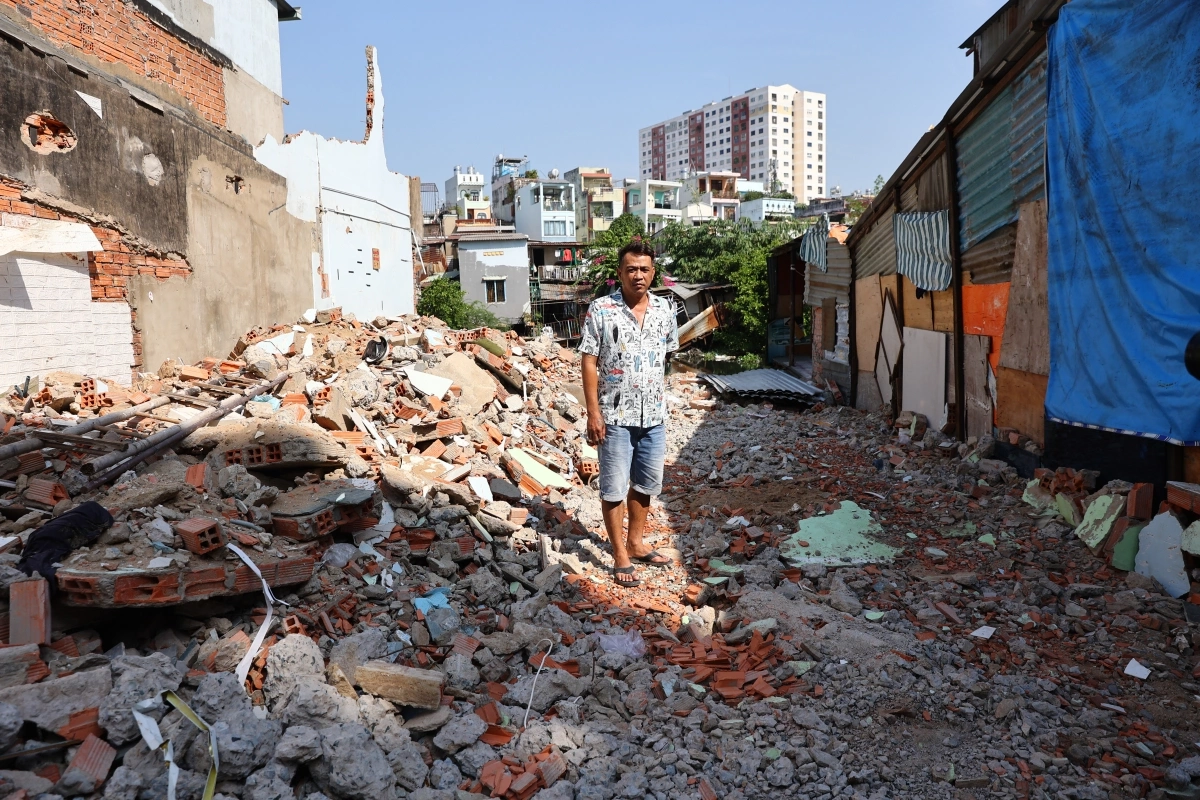 Ông Ngô Quốc Trung (48 tuổi) đứng bên nền nhà gia đình vừa bàn giao cách đây một tháng. Ngôi nhà rộng gần 70 m2, được bồi thường 36 m2 với số tiền 3,5 tỷ đồng. Ông dùng tiền mua nhà khác nhưng vẫn thuê gần chỗ cũ để tiện công việc.
