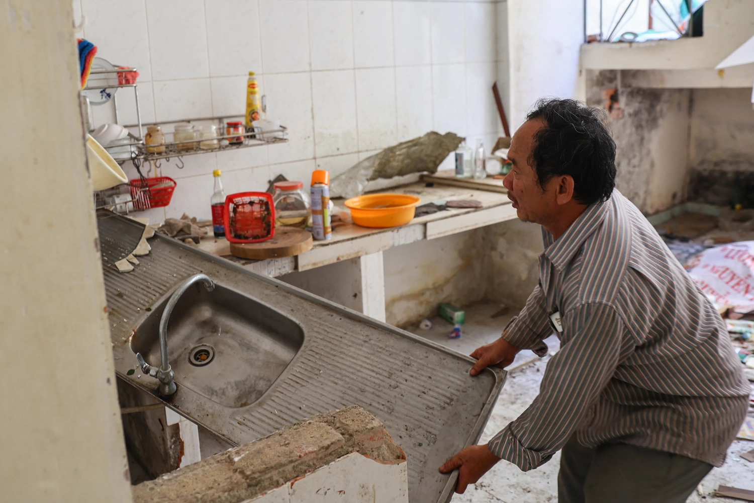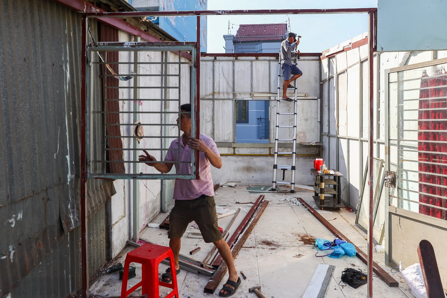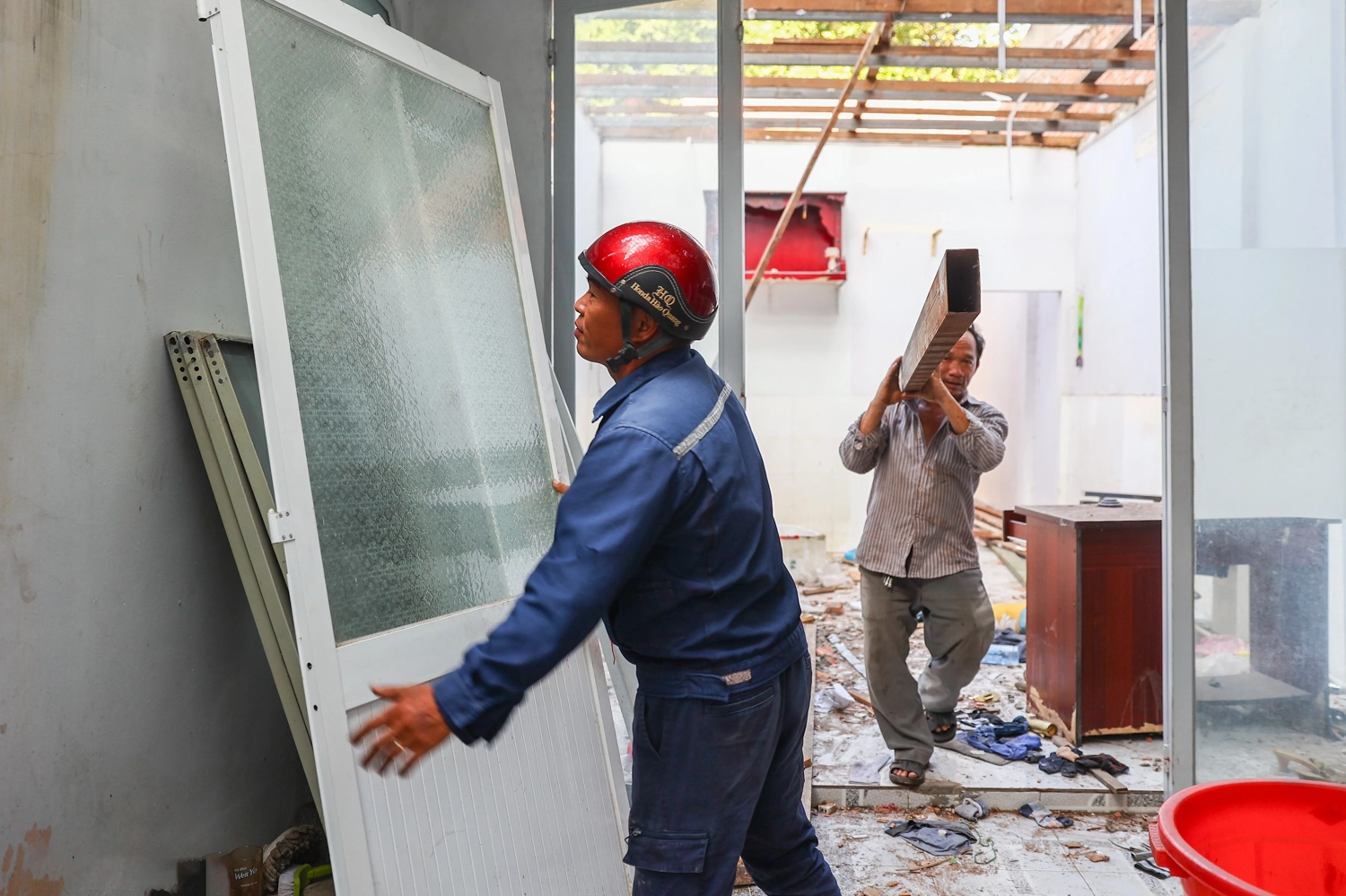 Bên trong nhà, nhóm công nhân khẩn trương dọn dẹp đồ đạc, tháo dỡ đường ống nước và dây điện.