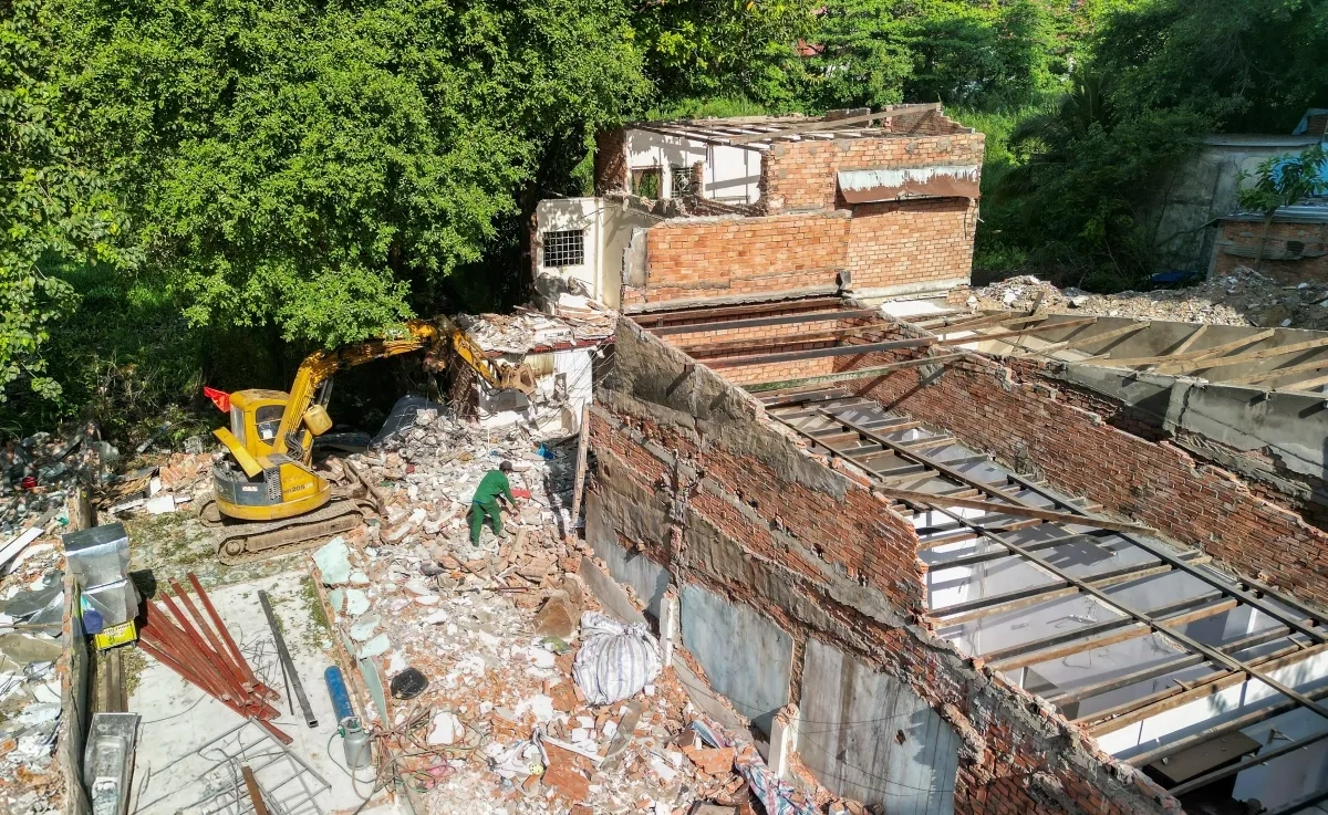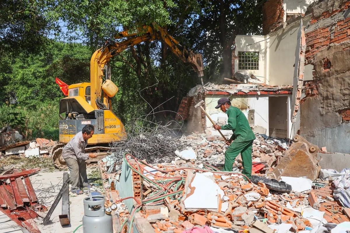 Cách đó khoảng 200m, hai căn nhà khác đang được xe cẩu phá dỡ, dọn xà bần và thu gom phế liệu.